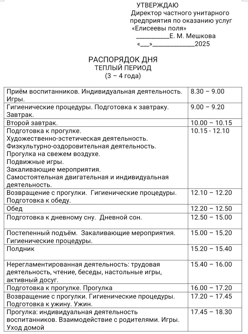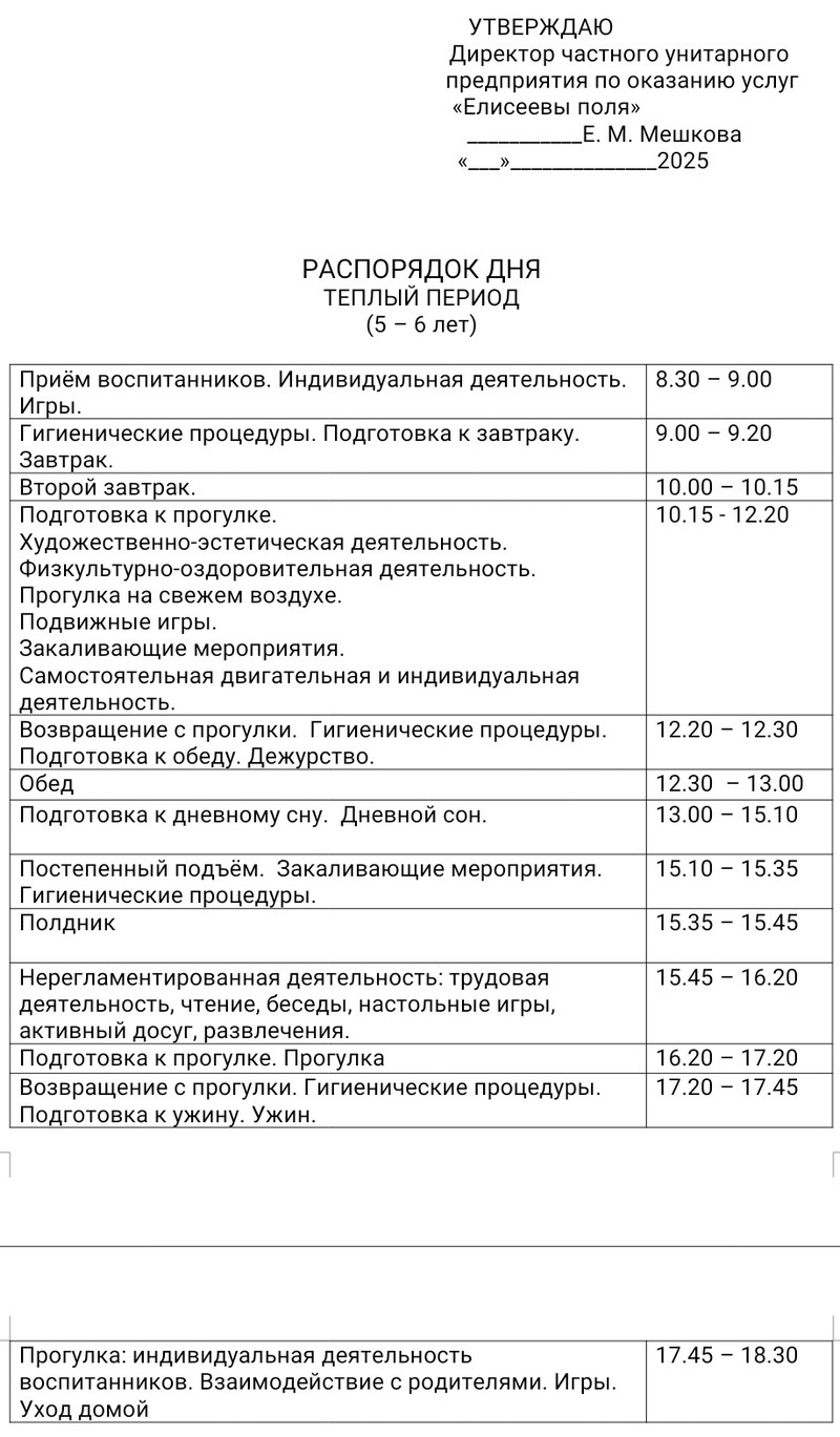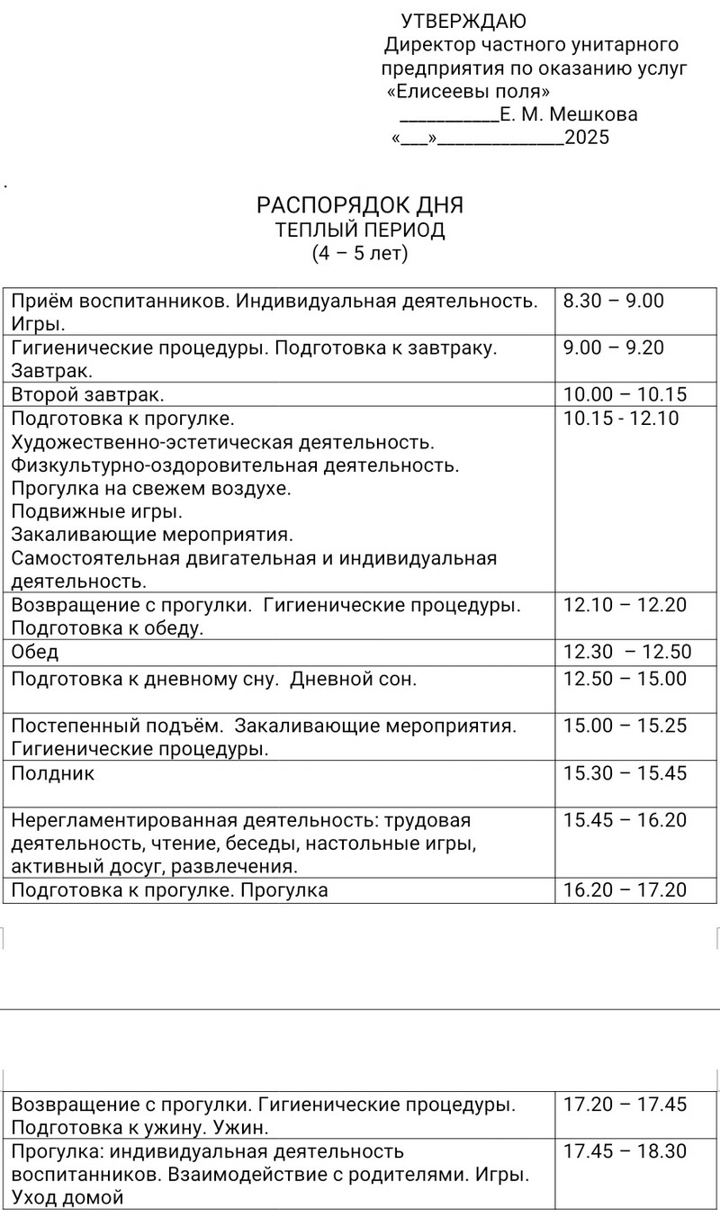 Распорядок дня в летний период