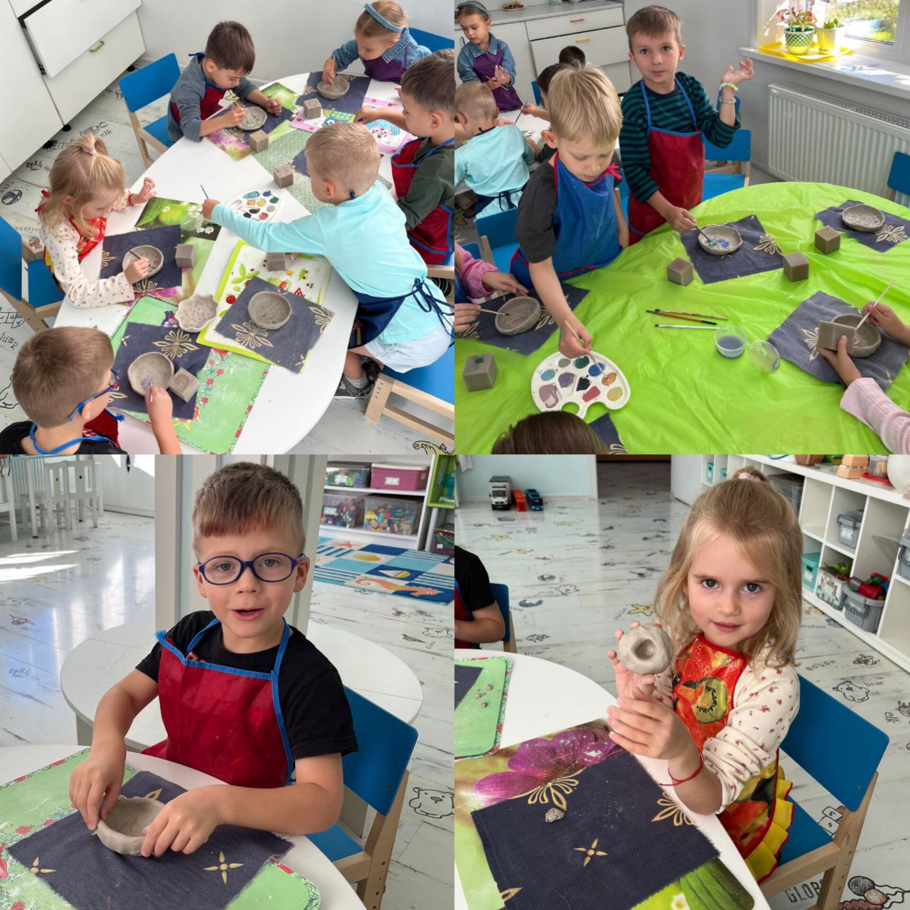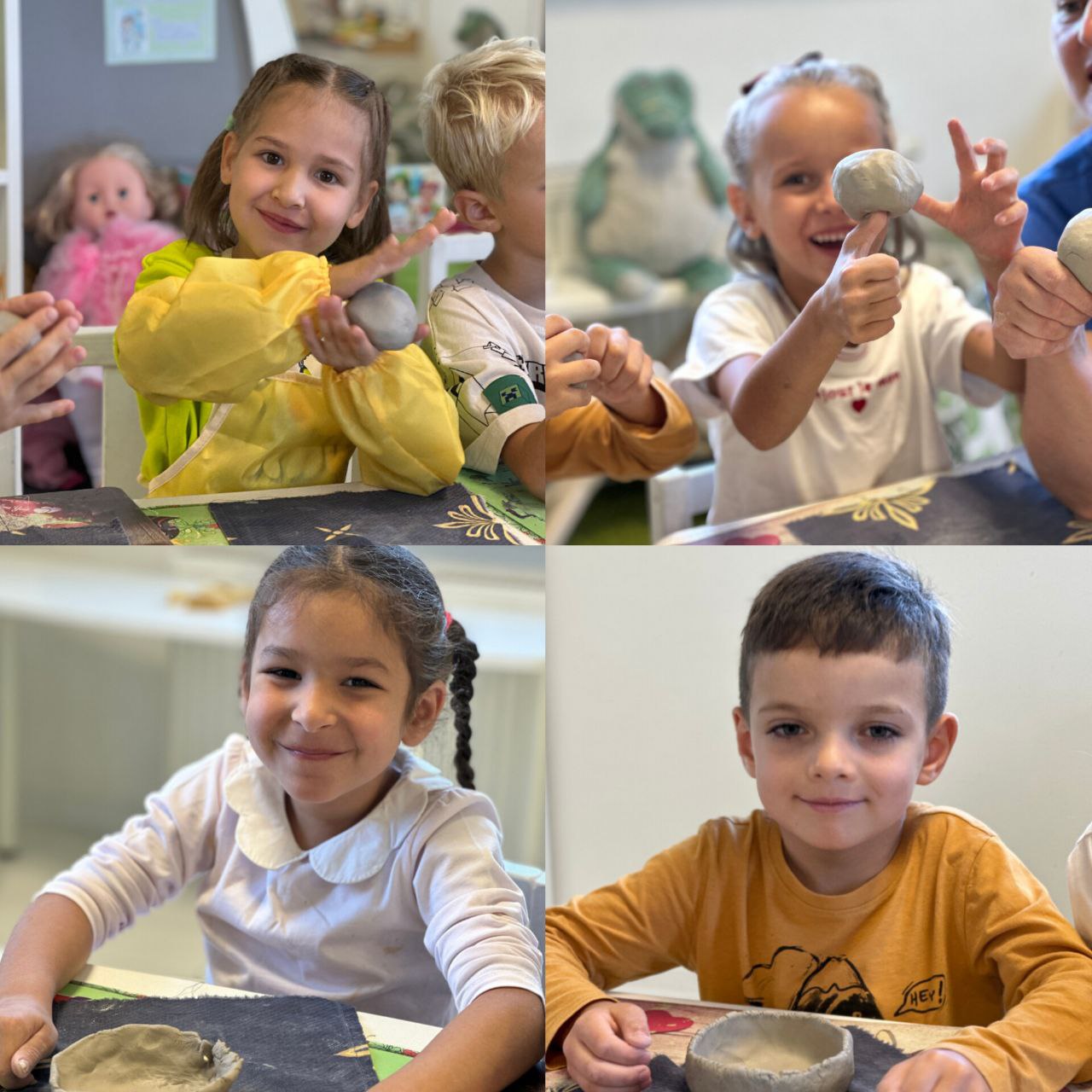 Маленьким мастерам предстояло смастерить настоящие глиняные тарелочки. С энтузиазмом они мяли податливую глину, придумывая формы и размеры будущих шедевров. Каждый старался придать своей тарелочке уникальный вид.