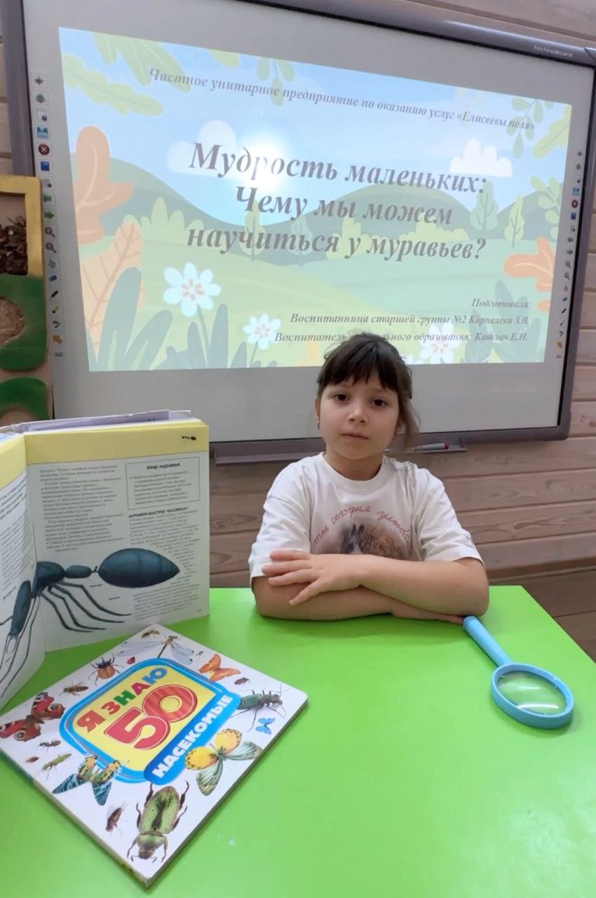 Еще один проект, который обещает быть не менее интересным, представит воспитанница группы №2, Злата также под руководством воспитателя группы Кашлач Е.Н. Ее работа "Мудрость маленьких: чему мы можем научиться у муравьев?" – это настоящее исследование жизни этих удивительных насекомых. Злата создала уникальную книгу "Мудрости муравья", где собраны ценные советы и рекомендации по формированию хороших привычек, почерпнутые из наблюдений за муравьиной колонией. Кто бы мог подумать, что эти крошечные создания могут преподать нам такие важные уроки о трудолюбии, взаимопомощи и дисциплине!
